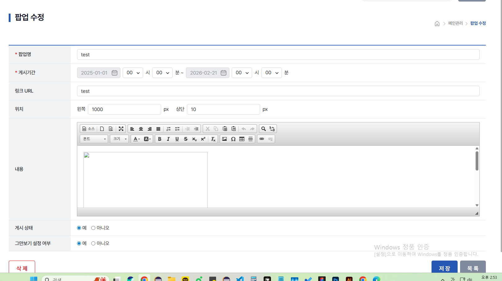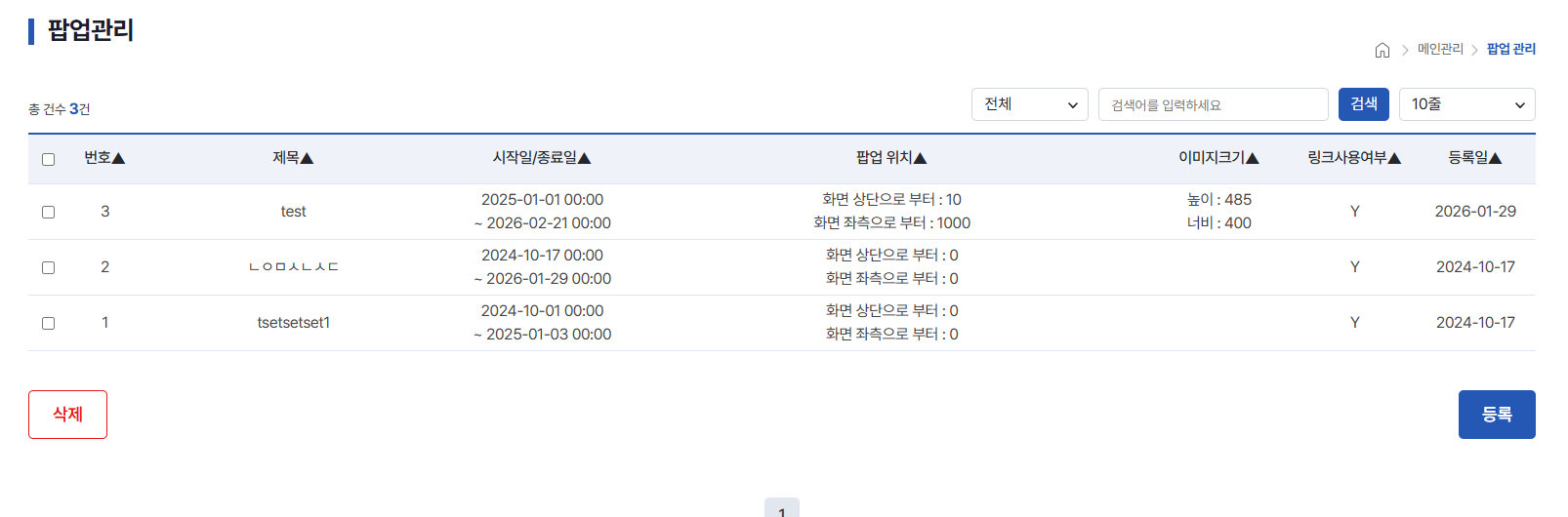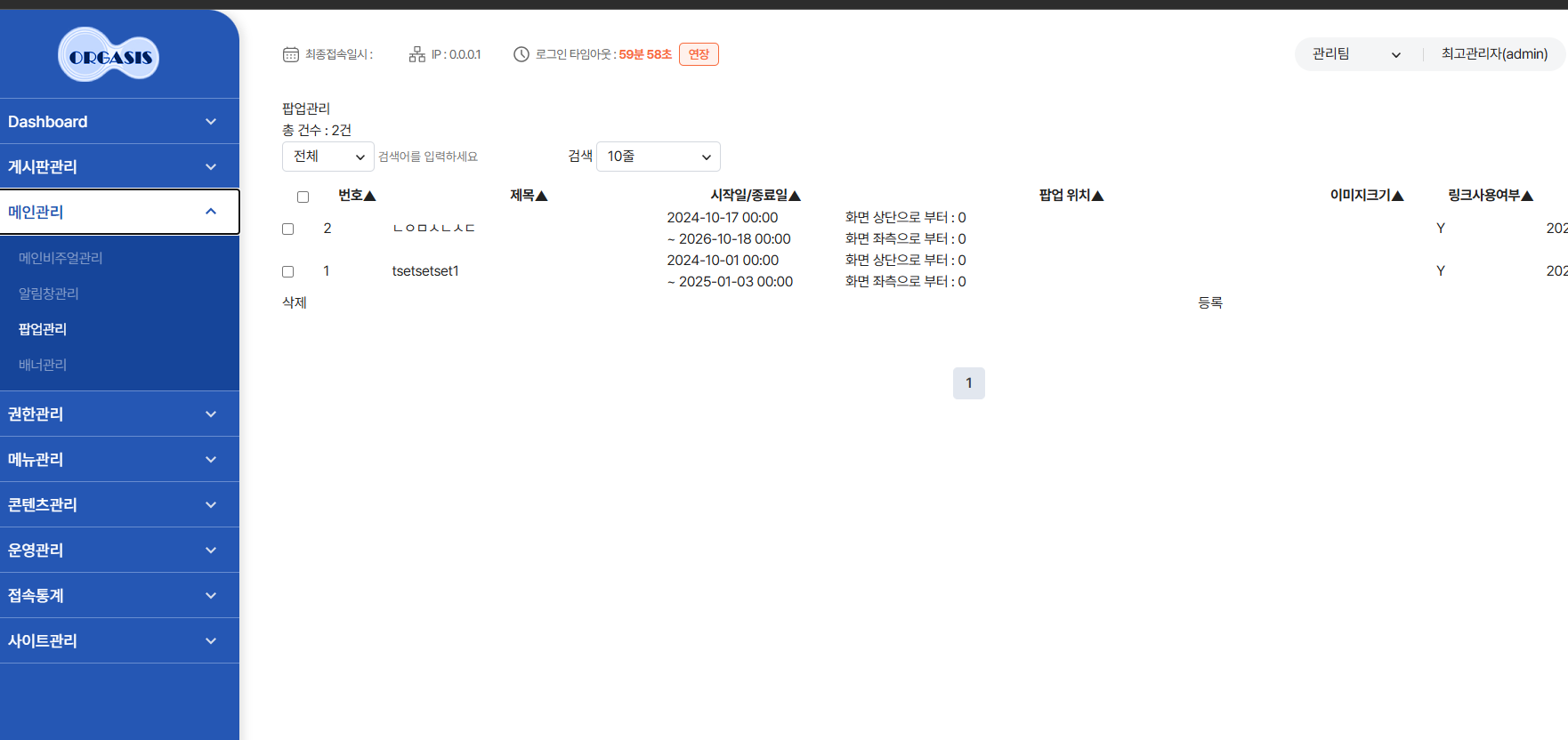관리자페이지 팝업관리, 등록, 수정 및 사용자 팝업화면 수정완료 하였습니다.